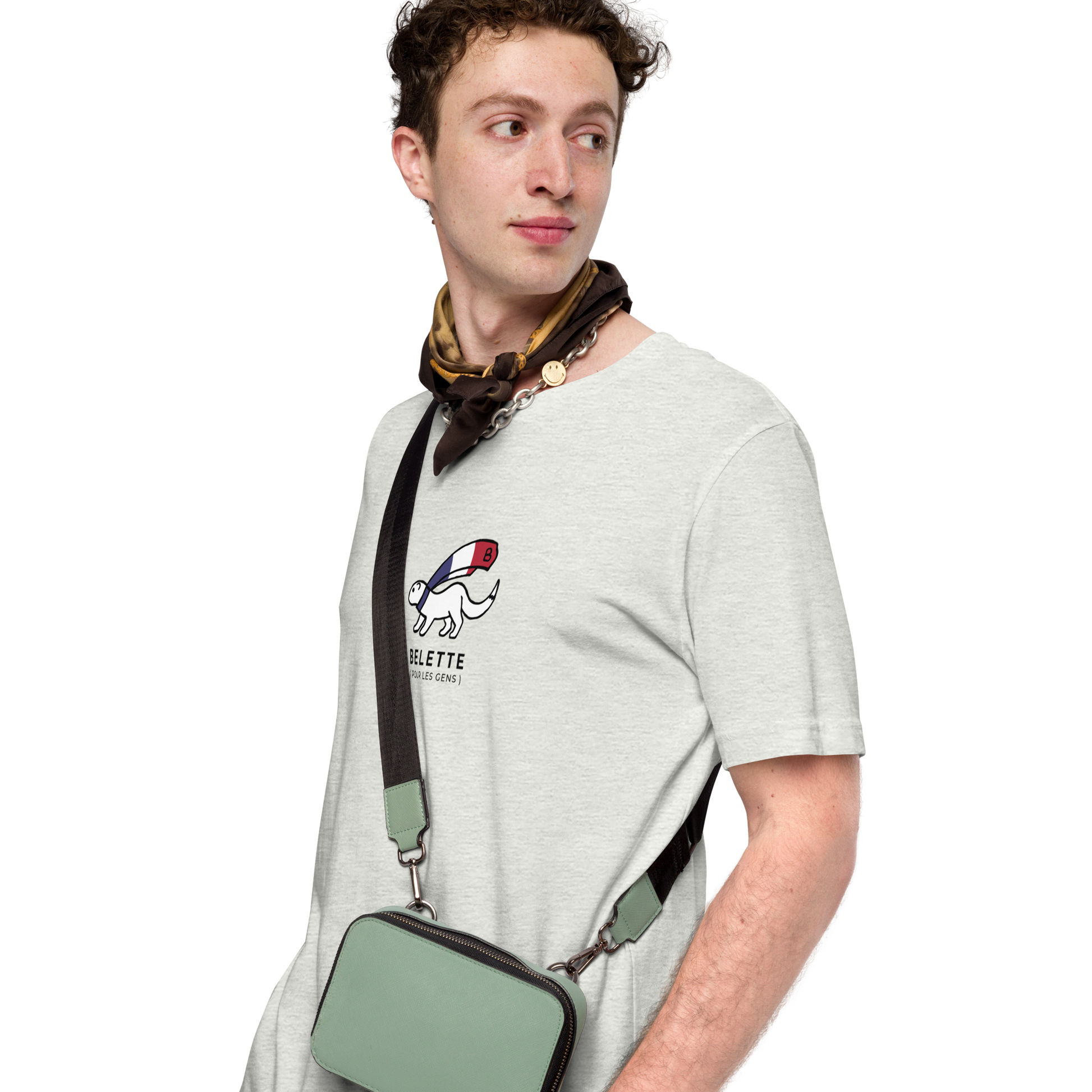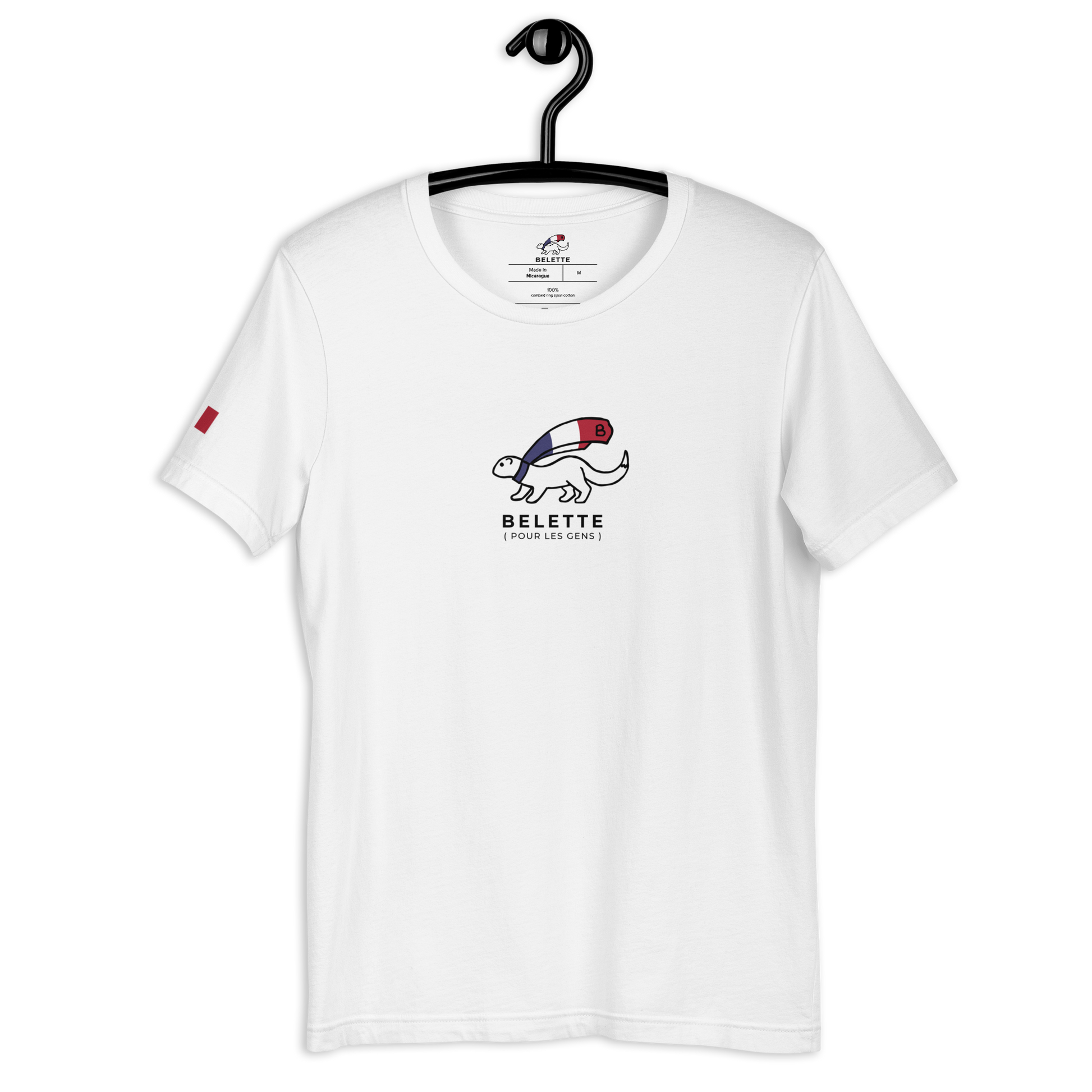 A bit of style for the people (weasels too.). This sporty tee says, "Pour les Gens" ("For the people.") and has the Belette logo with the French flag style scarf on the front.